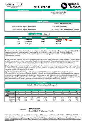 He was advised that now that his SIBO was resolved, if any lingering symptoms developed, a comprehensive stool microbiome profile could be considered to evaluate further gut health. At the time of writing, he has not needed any additional follow-up, suggesting continued success and stability.