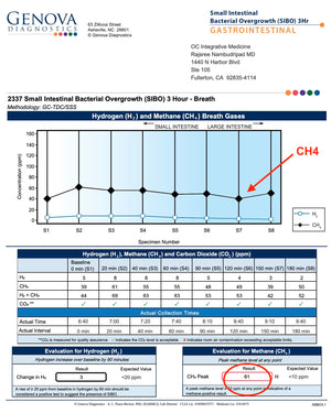 - Methane (CH₄): 61 ppm — diagnostic for severe Intestinal Methanogen Overgrowth (IMO)