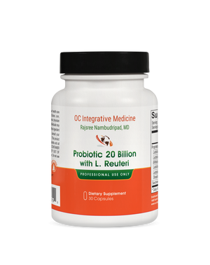 Probiotic 20 Billion with L. Reuteri is a unique blend of probiotic strains for individuals who have an altered microbiome that needs a targeted reset. For example, patients with chronic constipation, Irritable Bowel Syndrome (IBS), Small Intestine Bacterial Overgrowth (SIBO) and Intestinal Methanogen Overgrowth (IMO). These patients have been categorized as having a “resistor”-type microbiome that needs to be reset and renewed. This combination of strains including Lactobacillus reuteri, Streptococcus thermophilus, and Saccharomyces boulardii provide enhanced gut microbial variety and ecosystem stability.