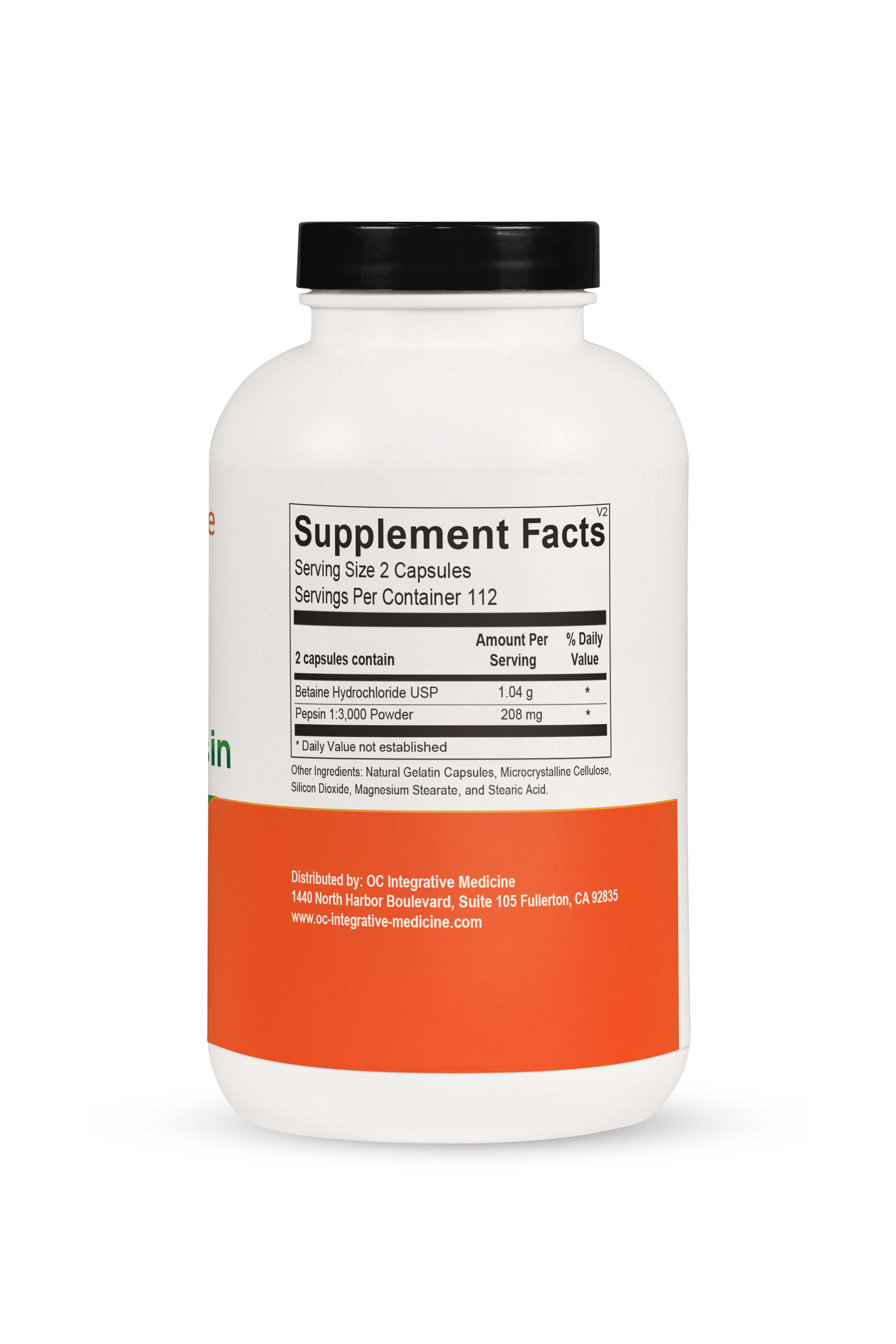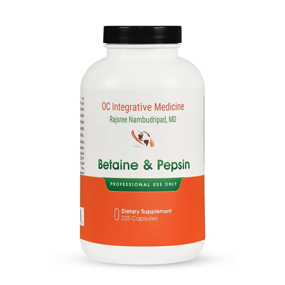 Betaine & Pepsin provides two essential components of healthy digestion: hydrochloric acid (HCl) and the digestive enzyme, pepsin. Hydrochloric acid is vital for the proper digestion of protein and the absorption of vitamins and minerals (especially vitamin B12, calcium, magnesium, copper and...
